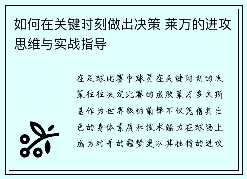 在足球比赛中,球员在关键时刻的决策往往决定比赛的成败。莱万多夫斯基,作为世界级的前锋,不仅凭借其出色的身体素质和技术能力在球场上成为对手的噩梦,更以其独特的进攻思维和高效的实战指导展现了在关键时刻做出精准决策的能力。这篇文章将从四个方面详细阐述如何在关键时刻做出决策,解读莱万的进攻思维与实战指导。这些方面包括:对比赛节奏的感知与调整、位置选择与空间利用、与队友的配合与默契、以及心理素质与压力管理。每一个方面都涉及到球员如何在瞬息万变的比赛中做出最为理智和高效的决策,进而影响比赛的走势与结果。